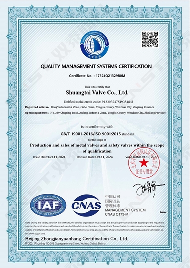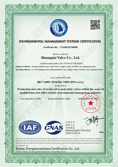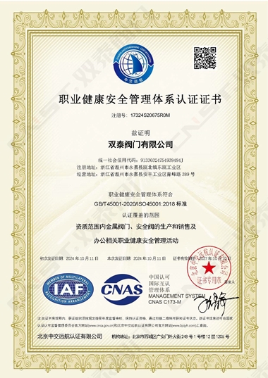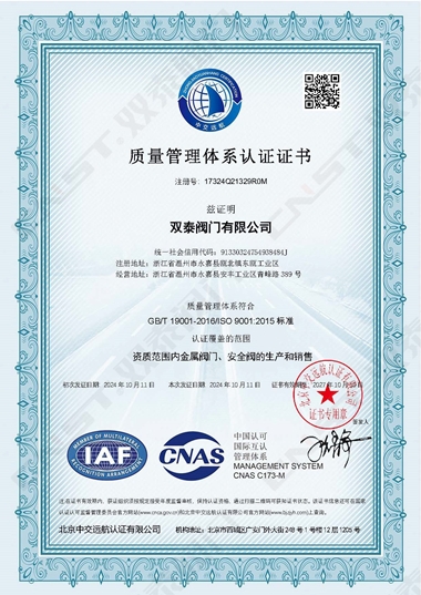 2024年10月,雙泰閥門有限公司更新資質(zhì)通過ISO9001質(zhì)量管理體系認(rèn)證、ISO14001環(huán)境管理體系認(rèn)證、ISO45001職業(yè)健康安全管理體系認(rèn)證。是獲得安全生產(chǎn)標(biāo)準(zhǔn)化達標(biāo)企業(yè)以來在管理方面的又一重大突破,標(biāo)志著工廠在管理水平方面再上一個新的臺階,并對提高公司的市場競爭力和品牌影響力有著重要的作用。對提高企業(yè)綜合管理水平,提升品牌美譽度,彰顯社會責(zé)任,降低環(huán)境風(fēng)險,起到重要的作用。